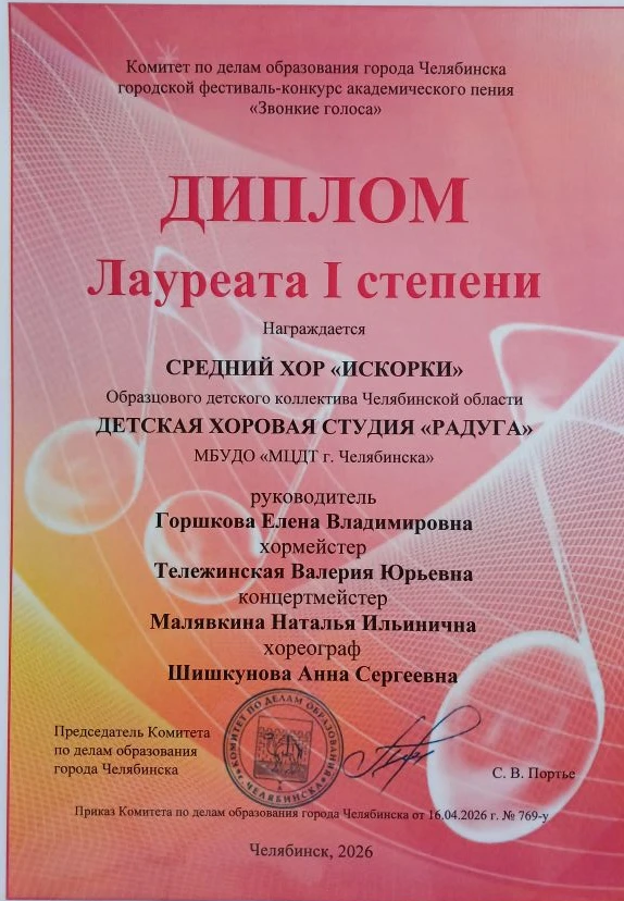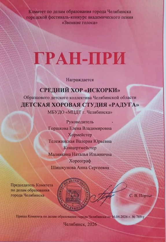 Городской конкурс-фестиваль «Звонкие голоса» завершился грандиозным Гала-концертом в Зале органной и камерной музыки «Родина» 23 апреля. С радостью и гордостью сообщаем о победе среднего хора «Искорки» Детской хоровой студии «Радуга»! Наши юные таланты были удостоены сразу двух высоких наград: диплома Гран-при и диплома лауреата первой степени. Это невероятное достижение – результат упорного труда и безграничной любви к музыке! Мы поздравляем ребят, педагогов Горшкову Елену Владимировну и Тележинскую Валерию Юрьевну с заслуженной победой! Это значимое достижение для коллектива и подтверждение его творческого потенциала.